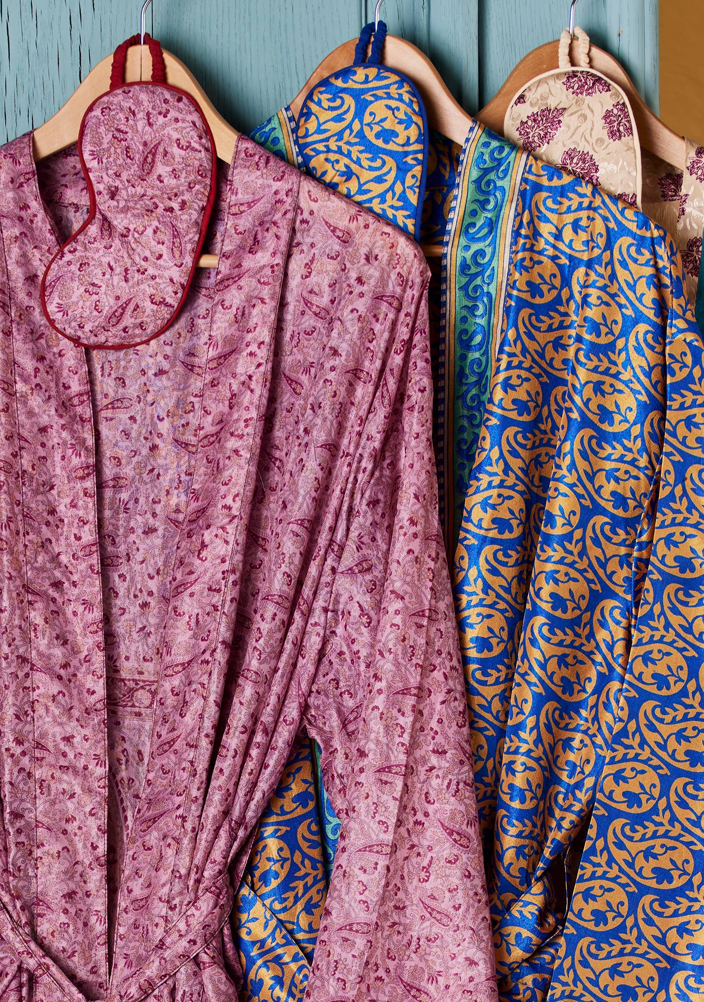 A soft recycled sari material eye mask in assorted colours and fabric designs. Soft, lightweight and comfortable for the sensitive eye area, this blackout sleep mask is fitted with a gently elasticated headband and finished neatly in piped cotton edges.